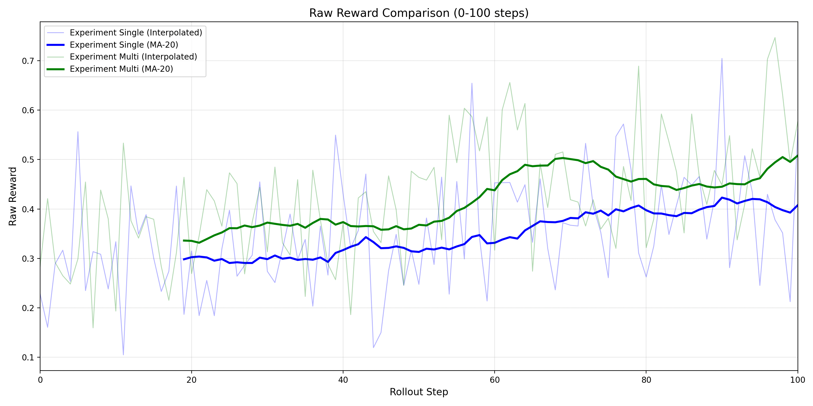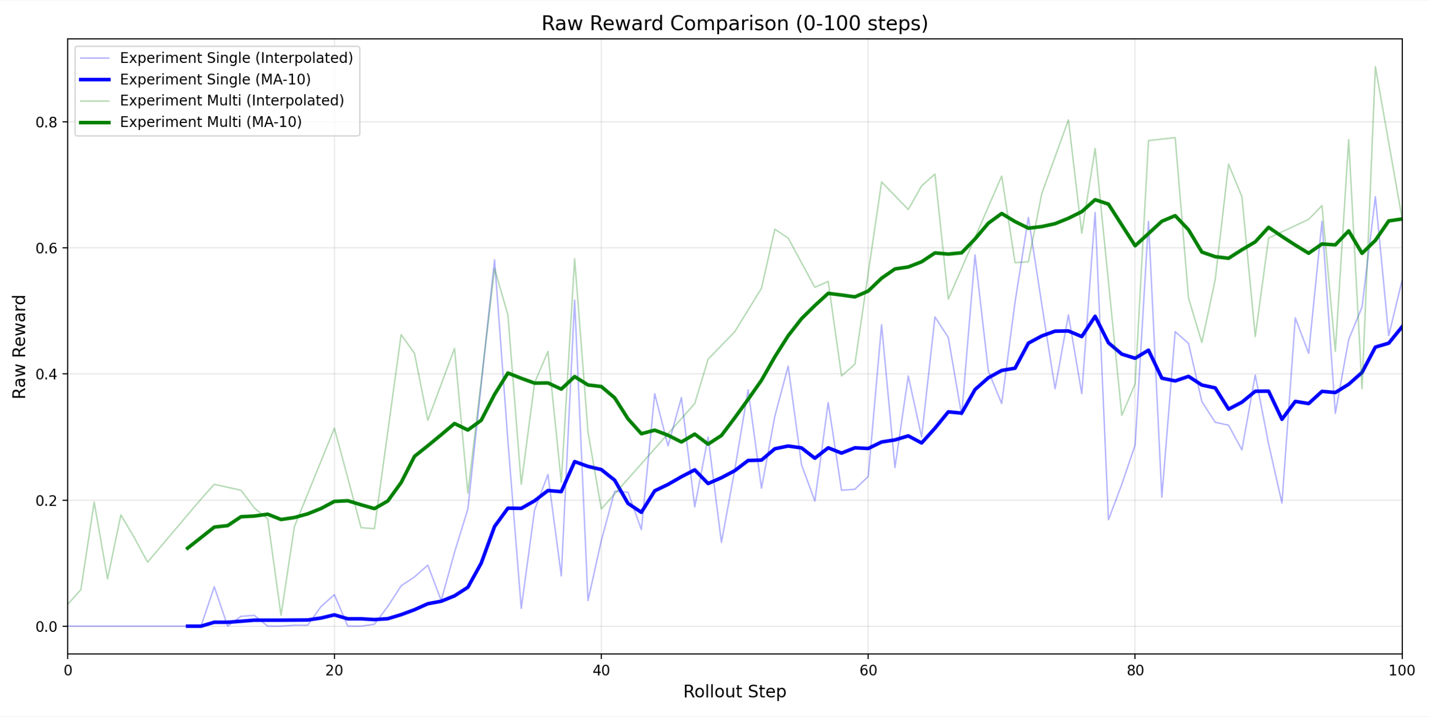 As the single-agent baseline configuration slightly difffers from the multi-agent setup, the initial rewards are inconsistent. More rigorous ablation study will be presented in the following paper.
