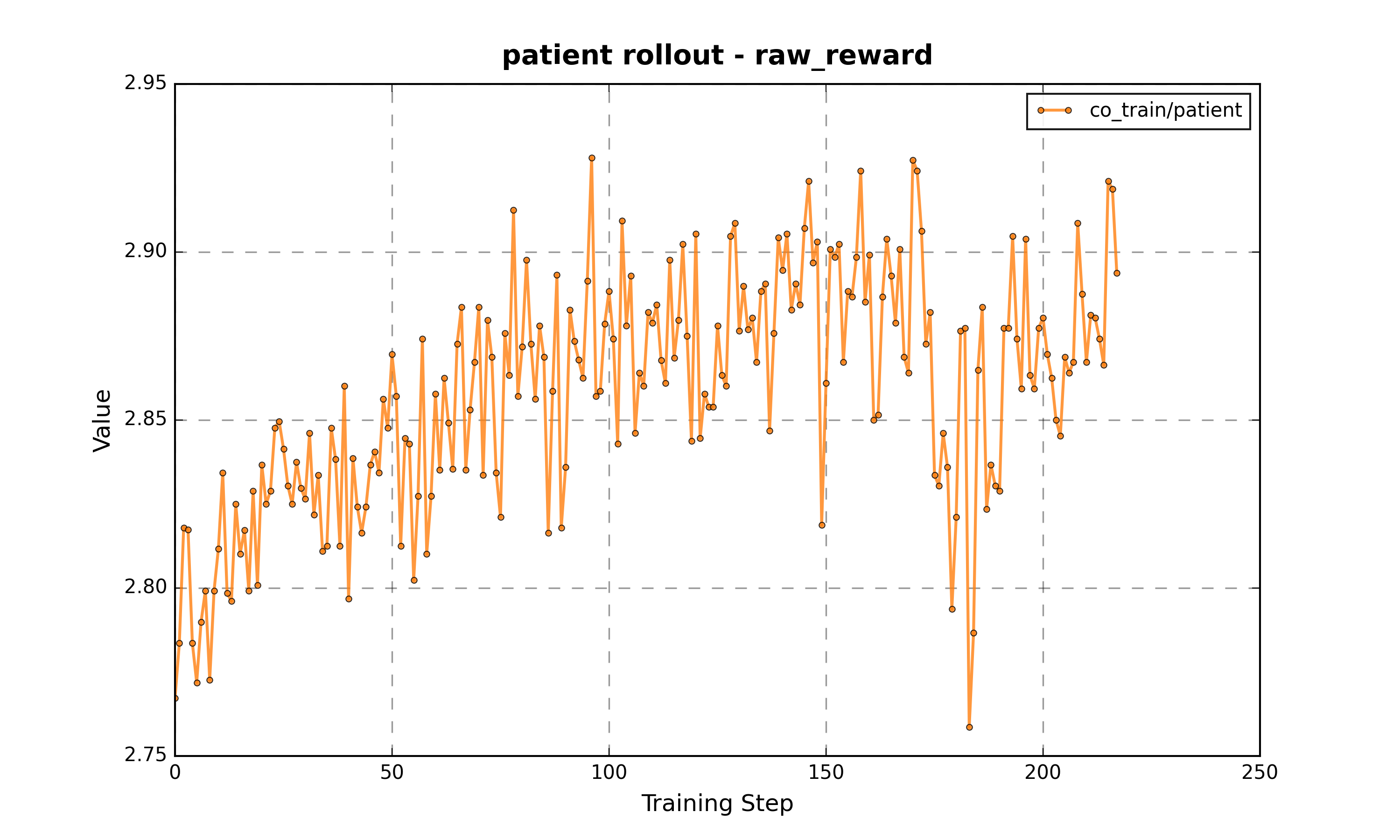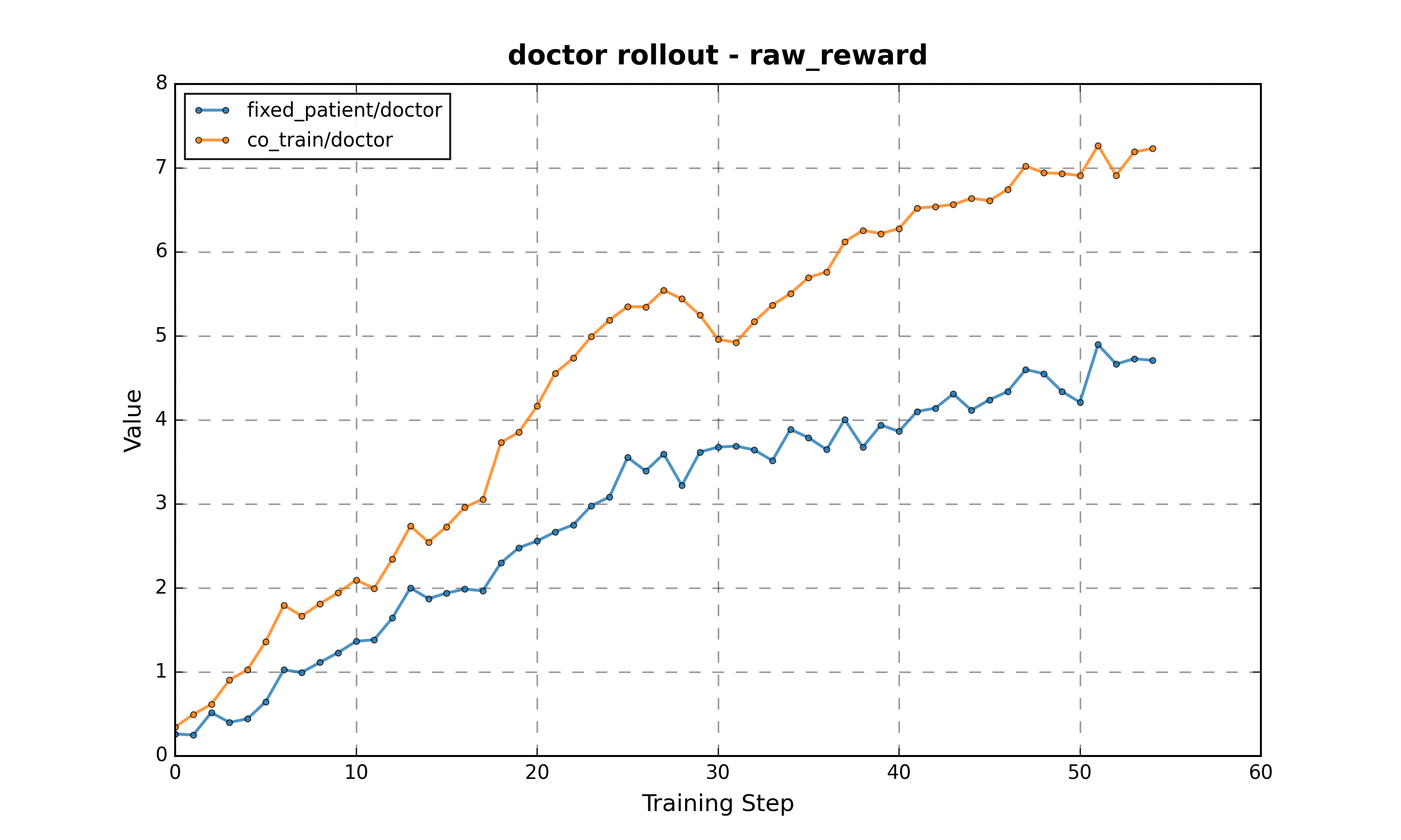 As illustrated by the reward curves below, the joint training methodology produces significant improvements for both agents compared to the clinician-only baseline. This highlights the value of co-evolving patient simulators to achieve superior diagnostic interviewing capabilities in LLMs.
